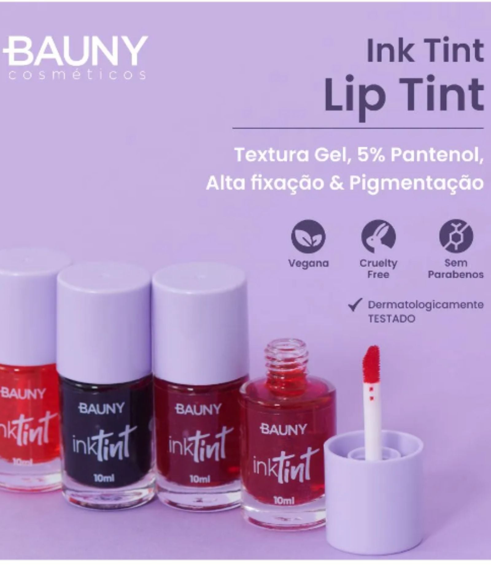 Meu Ink Tint chegou para te trazer alta fixação, pigmentação e cuidado com seus lábios. Para você que gosta do acabamento opaco e resistente do lip tint, o meu Ink Tint é tudo que você desejava. Com 5% de Pantenol, meu Ink Tint promove a hidratação da pele, retendo umidade por muito mais tempo, prevenindo envelhecimento precoce dos lábios e renovação da pele.